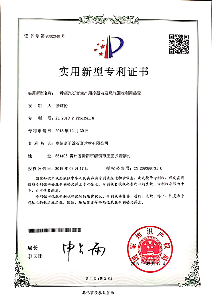 專(zhuān)利證書(shū)(一種蒸汽石膏生產(chǎn)用冷凝液及尾氣回收