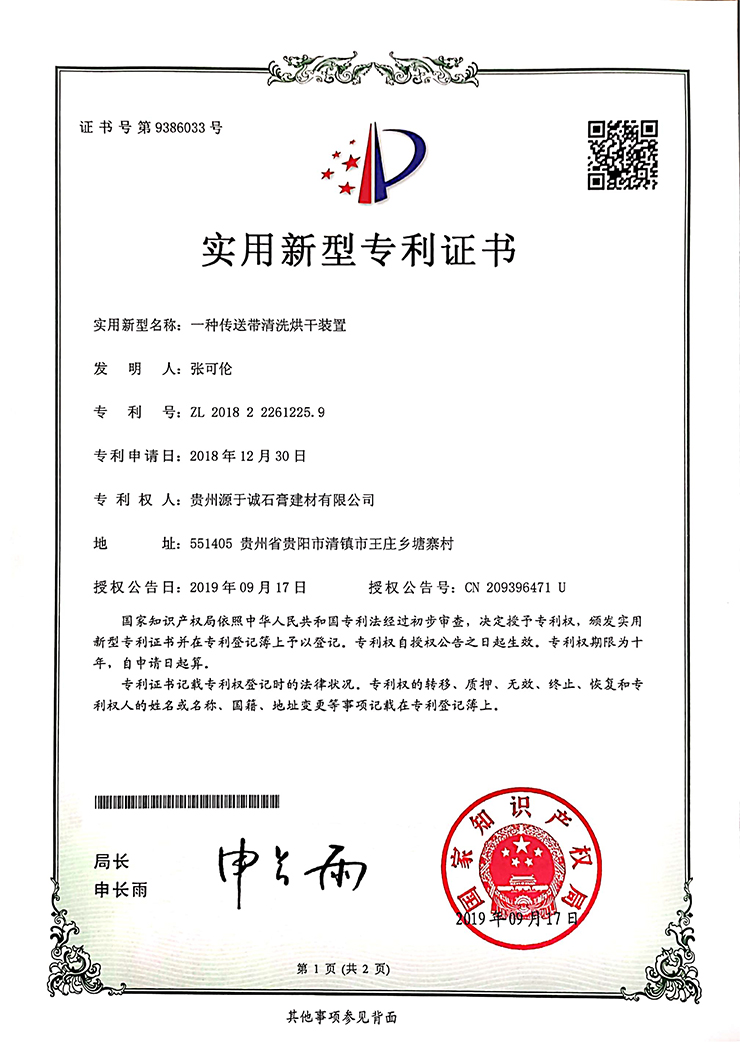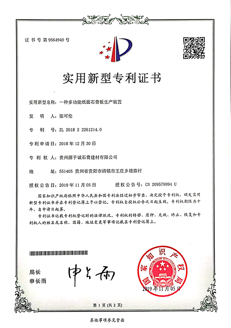 專(zhuān)利證書(shū)(一種多功能紙面石膏板生產(chǎn)裝置)