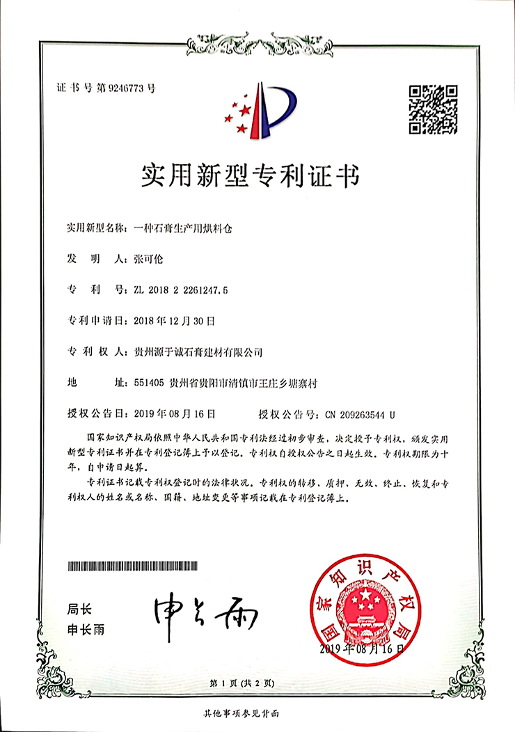專(zhuān)利證書(shū)(一種石膏生產(chǎn)用烘料倉(cāng))