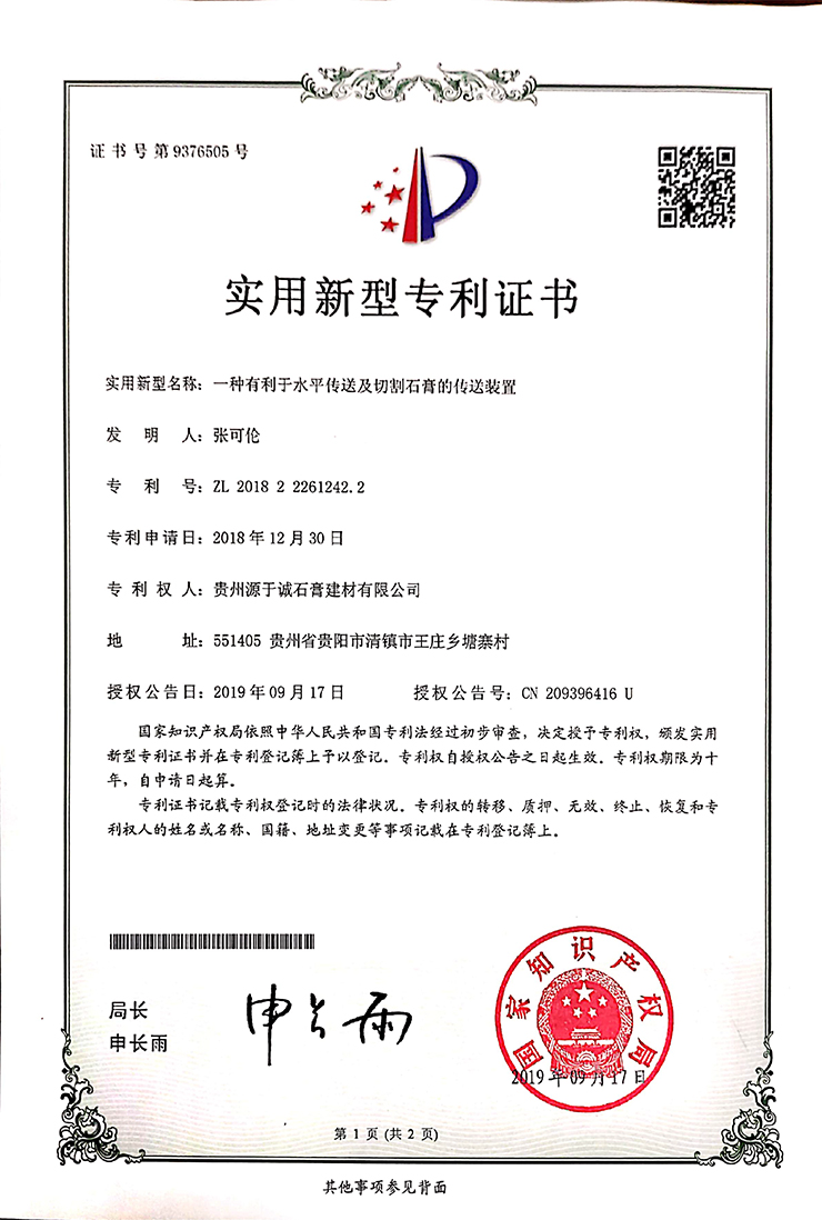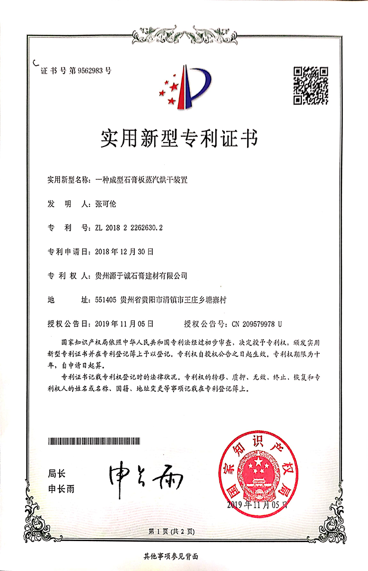 專(zhuān)利證書(shū)(一種多功能紙面石膏板生產(chǎn)裝置)