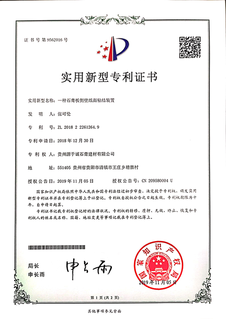 專(zhuān)利證書(shū)(一種石膏板側(cè)壁紙面粘結(jié)裝置)